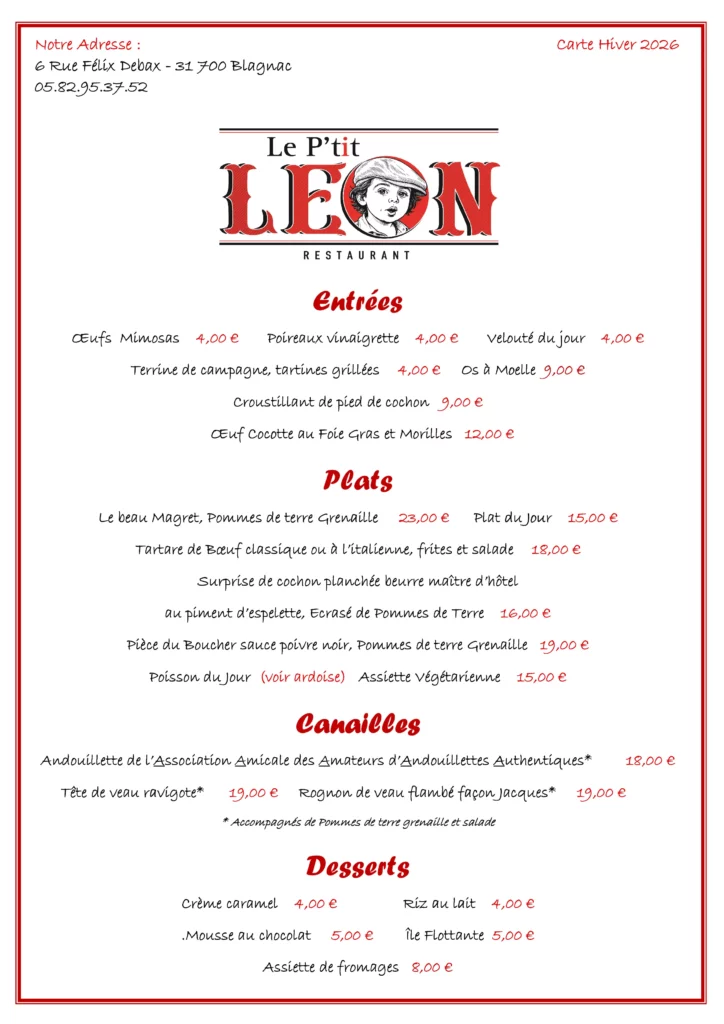 Le ’Ptit Léon est un restaurant traditionnel à Blagnac, en Haute-Garonne, proposant une cuisine française authentique, faite maison, à partir d’ingrédients de qualité.